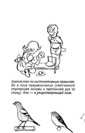 прихода времени размножения у многих видов самцы и самки чень похожи друг на друга и интереса к противоположному полу почти не проявляют. Мальчишки и девчонки тоже до определенного возраста «презирают» друг друга. Но вот приближается время размножения, выработка половых гормонов (разных у самцов и самок) увеличивается, и под их влиянием внешний вид преобразуется. Если животные размножаются раз в жизни, как многие насекомые или лососи, новый облик образуется раз в жизни. У размножающихся всю жизнь животных (человек среди них) изменения тоже происходят один раз и на всю жизнь. А у сезонно размножающихся видов — некоторых рыб, многих птиц и млекопитающих — признаки готовности к размножению проявляются в сезон размножения, потом исчезают и с наступлением нового сезона появляются вновь. Признаки пола и готовности к размножению очень разнообразны, по возможности свои у каждого вида. Одни виды действуют довольно экономно: у них такими признаками служат неизбежные при размножении изменения облика (например, о готовности самки к размножению у многих видов рыб сообщает вздувшееся из-за запасов икры брюхо). Другие отращивают что-нибудь новенькое. Так, у самцов тритона на спине и хвосте вырастает яркий гребень, у самца лосося искривляется челюсть, и весь он покрывается красными пятнами, у самцов оленей вырастают рога, у многих обезьян — гривы, усы и борода; у птиц из перьев образуются целые небывалые наряды, отрастают гребни, набухают сережки. Многие самцы начинают издавать особые звуки (тут и стрекот кузнечиков, и кваканье лягушек, и рев оленей и обезьян, и невероятно Разнообразное пение птиц). Не забыты не только зрение и слух, но и обоняние: очень многие животные обретают особый запах готовности к размножению, конечно же, разный у самцов и самок. Назначение всех этих сигналов — выделить, обозначить готовящуюся к размножению особь. Подобные признаки у людей называются вторично-половыми. У мужчин это борода и усы, грубый голос и особый запах. У женщин — утолщенные и яркие губы, груди, Ширенные округлые бедра, высокий голос и особый запах. Для выделения запаха у обоих полов на лобке и в подмышках вырастают волосы. Набор признаков, известный и у других приматов и довольно экономный: только изменения голоса, запаха, оволосения и губ не участвуют в размножении. Видимо, из-за лак низма естественного набора признаков дополняем и усиливаем их различием в прическа одежде, парфюмерными запахами, подкращи' ванием губ и многими прочими украшениями