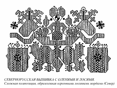 Нити связи тянутся от Оленьего острова к пермским бляшкам на протяжении 6000 лет. Недаром до наших дней сохранилось интересное имя острова, напоминающее о культе оленей. Промежуточным хронологическим звеном между далеким мезолитом и шаманскими бляшками Приуралья является ритуальное бронзовое литье кулайской культуры за Уралом, в верховьях Оби и Енисея, т. е. в районе бытования современного фольклора, упомянутого выше.(Косарев М. Ф. Древние культуры Томско-Нарымского Приобья. М., 1974, с. 144-146, рис. 44-46; Кулапская культура датируется автором V в. до н. э. - IV в. н. э., т. е. скифо-сарматским временем.) Здесь много отдельных фигурок лосей, но есть и композиция с двумя лосиными мордами и человеческой фигурой в центре, есть шаманское древо жизни, ящеры. Очень четко в кулайском литье выражена идея трехъярусности мира. Культ оленей и лосей в неолите, энеолите и бронзовом веке представлен огромным количеством петроглифов, писаниц, оленных камней Европы, Кавказа и Сибири. Для нашей цели особый интерес представляют изображения двух небесных оленей в такой земледельческой культуре, как трипольская. В энеолитических и неолитических земледельческих культурах Балканского полуострова, Подунавья и Правобережной Украины встречаются глиняные фигурки "чародеек", т. е. женщин, заклинающих священную воду в большой мисообразной чаре. Особенно интересна скульптура из Бечея (Югославия): обнаженная женщина в торжественной позе сидит на узорчатом седалище; на ее коленях стоит большая чара.(Grbic Miodrag. A Neolithic Statuette from Becej in Banat. - Archaeologia Jugoslavica. Belgrad, 1954, 1, c. 16-27, fig. 1-4.) Русская и украинская этнография знает много примеров "волхвования водою", различных аграрно-магических действий с "живой водой". В новогодних заклинаниях будущего урожая и будущих дождей, от которых он зависит, часто фигурирует сосуд с водой, над которым поют "подблюдные песни", "славу хлебу", бросают в воду золотые кольца, гадают. Воду берут из 12 колодцев; нередко сосуд с водой ставят "под звезды". От заклинаний воды в чаре происходит и слово "чародейство", колдовство, аграрная магия, связанная с водой и молениями о дожде. В древнерусских источниках рядом стоят "чаровники" и "облакопрогонители"; "чаровать тайными словесами" приравнивалось к понятию "волхвовать водою". Древнейшей "чародейкой" является статуэтка из Бечея.