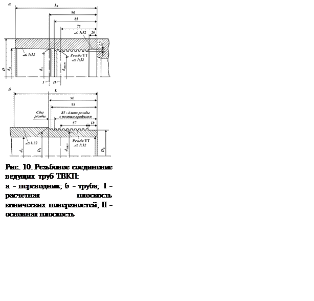 Трубы ТВКП (рис. 9) отличаются коническими стабилизирующими поясками и переводниками. Прочность и герметичность резьбового соединения обеспечиваются трапецеидальной резьбой профиля ТТ с углом 30° (ГОСТ 631-75) и коническим стабилизирующим пояском конусностью 1:32. Поясок протачивают на стандартной горячекатаной ведущей трубе квадратного сечения за резьбой профиля ТТ. Трубы ТВКП изготавливают по ТУ 51-276-86. Переводники изготавливают из стали марки 40ХН или ХН2МА. Верхний переводник снабжен левой резьбой для предотвращения его самопроизвольного отвинчивания от ствола вертлюга. Размеры соединений приведены на рис. 10. Сборка переводник с трубой по резьбе профиля ТТ должна производиться горячим способом с нагревом переводников до температуры 380 - 450 °С. После свинчивания соединения должно быть обеспечено сопряжение торца трубы и внутреннего упорного торца переводника по всему периметру стыка упорных поверхностей. Резьбы профиля ТТ ведущей бурильной трубы контролируются резьбовыми и гладкими калибрами. В верхнем ТВВК и нижнем ТВНК переводниках контролируются внутренняя резьба профиля ТТ и коническая расточка, а также внутренняя и наружная замковые резьбы. Промышленностью осваиваются ведущие бурильные трубы цельной
