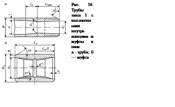 Короткие трубы (6 м) с резьбой треугольного профиля соединяются между собой соединительными муфтами. Размеры и массы труб типа 1 и муфт к ним должны соответствовать рис. 16, типа 2 - рис. 17, типа 3 - рис. 18, а, типа 4 - рис. 18, б. Трубы типов 1, 2 изготовляются с правой и левой резьбами, трубы типов 3, 4 - с правой резьбой и по соглашению потребителя с изготовителем - с левой. Трубы всех типов изготовляются длиной: 6,8 и 11,5 м при условном диаметре труб 60-102 мм; 11,5 м - при условном диаметре труб 114-168 мм. В поставляемой партии допускается до 25 % труб длиной 8 м и до 8 % - длиной 6 м. С согласия потребителя допускается изготовление труб диаметром 114 мм, длиной 6 и 8 м. Длина трубы определяется расстоянием между ее торцами, а при наличии навинченной муфты - расстоянием от свободного торца муфты до последнего витка резьбы другого конца трубы. Кривизна труб на концевых участках, равных трети длины трубы, не должна превышать 1,3 мм на 1 м. Общая кривизна трубы (стрела прогиба) на середине длины трубы не должна превышать 1/2000 длины трубы. Кривизна конца трубы - частное от деления стрелы прогиба на расстояние от места измерения до ближайшего конца трубы. Длина высадки в расчет не принимается.