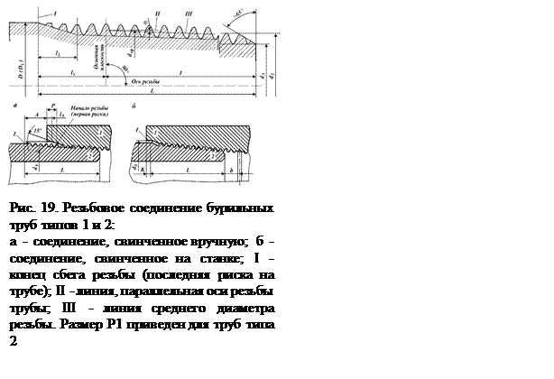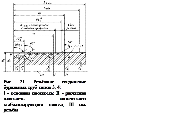 Размеры резьбовых соединений бурильных труб типов 1 и 2 приведены на рис. 19. Профиль трапецеидальной резьбы труб типов 3 и 4 и их резьбовые соединения приведены соответственно на рис. 20 и 21. К высаженному концу труб ВК и НК предъявляются следующие требования. Торец трубы должен быть перпендикулярен к оси резьбы. Неперпендикулярность не более 0,06, неплоскостность - не более 0,1 мм. Оси резьбы и конического стабилизирующего пояска должны совпадать. Допустимое отклонение от соосности не более 0,04 мм. Разностенность в плоскости торца трубы должна быть не более: 4 мм для труб диаметром 73 мм; 4,5 мм для груб диаметром 89 и 102 мм; 5 мм для остальных диаметров труб 114, 127 и 140 мм Поверхности конического стабилизирующего пояска и торца трубы должны быть гладкими, без заусенцев и других дефектов. На наружной поверхности высаженной части трубы, подвергающейся механической обработке, допускается выполнять переход с конического стабилизирующего пояска на цилиндрическую поверхность под углом не более 15 % с оси трубы. Место перехода механически обработанной поверхности трубы к необработанной поверхности наружного диаметра высадки допускается выполнять под углом не более 15° к оси трубы. Наружный диаметр высадки должен допускать прохождение гладкого калибра кольца диаметром на 2,5 мм меньше диаметра высадки. Трубы и муфты в зависимости от групп прочности изготовляют из углеродистых (сталь марки 45) и легированных сталей марок 38ХНМ, 36Г2С, 35Г2СВ и др. Трубы групп прочности К, Е изготовляют из легированных сталей путем нормализации с отпуском или из углеродистых сталей (закалка, отпуск) группы прочности Л, а трубы групп прочности выше Л (М, Р) - из легированных сталей (закалка - отпуск). Муфты для труб типов 1 и 2 диаметром 114 мм и менее должны изготовляться из сталей группы прочности с более высокими механическими свойствами. По соглашению изготовителей и потребителя допускается изготовление труб и муфт одной группы прочности. Трубы диаметром более 114 мм и муфты к ним изготовляются одной группы прочности. На каждой бурильной трубе на расстоянии 0,4 - 0,6 м от ее конца наносится маркировка клеймами: номер трубы, группа прочности, толщина стенки, наименование или товарный знак завода-изготовителя, месяц и год выпуска. Клеймо должно быть обведено светлой краской. На каждой муфте должен быть выбит товарный знак завода-изготовителя. Все клейма на каждой трубе и муфте наносятся вдоль образующей, Рядом с клеймами на каждой трубе вдоль образующей наносится маркировка устойчивой светлой краской.