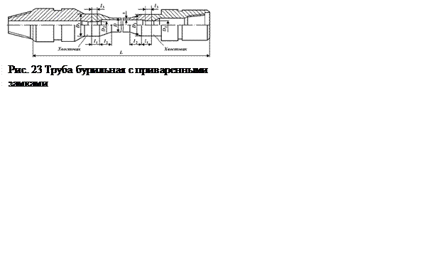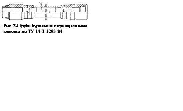 Трубы бурильные с приваренными замками выпускаются по ТУ 14-3-1293-84 и по ТУ 14-3-1187-83. Условное обозначение труб по ТУ 14-31293-84: ПК114х8,56; ПК127х9х9,19. Размеры, предельные отклонения, масса труб по ТУ 14-3-1293-84 должны соответствовать указанным на рис. 22 Овальность и разностенность не должны выводить размеры труб за предельные отклонения по наружному диаметру и толщине стенки. На поверхности труб не должно быть плен, раковин, закатов, расслоений, трещин. Механические свойства труб должны соответствовать группе прочности Д. Наружная и внутренняя поверхности высаженной части труб и места перехода от высаженной части к гладкой части труб не должны иметь резких уступов и складок; переход от высаженной части к гладкой должен быть плавным по всей длине. На внутренней поверхности высаженной части труб (до приварки замков) на длине 40 мм от торца незаполнения металлом не допускаются; на длине более 40 мм допускается одно пологое незаполнение металлом шириной не более 40 мм.
