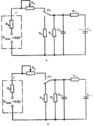 15. Эквивалентная схема аппарата ИВЛ: а — вдох; б — выдох; Рmах — максимальное давление генератора вдоха; Rв — внутреннее сопротивление генератора вдоха; Rp — регулятор скорости вдувания; Г — генератор вдоха; РУ — распределительное устройство; RЕ — сопротивление линии выдоха; Rу — сопротивление утечки; Са — внутренняя растяжимость аппарата; Rп — сопротивление дыхательных путей пациента; Сл — растяжимость легких пациента.