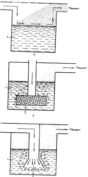 Увлажнители без подогрева дают возможность получения «холодного пара». Простейший тип, получивший название «проточный испаритель» («blow over», или «draw over», английских авторов), представляет собой резервуар с водой, над поверхностью которой проходит дыхательная газовая смесь, насыщаясь водяным паром (рис. 32,а). Между отдельными моделями увлажнителей этого типа нет существенных функциональных различий. Их производительность определяет температура жидкости (чем выше температура, тем больше жидкости преобразуется в молекулярное состояние), температура газовой смеси (чем выше температура, тем больше влагоемкость газа, а следовательно, и абсолютное количество пара, которое может содержаться в газе), поверхность испарения (чем больше контактная поверхность между жидкостью и газом, тем значительнее испарение воды), время контактирования газа с водой (чем выше объемная скорость газа, проходящего через испаритель, тем интенсивнее испарение; это не значит, однако, что концентрация паров воды, содержащихся в единице объема проходящего газа, становится выше). При исследовании работы проточных испарителей было обнаружено, что при обычных условиях помещения они сообщают дыхательной смеси не более 20% относительной влажности при температуре 37°С, при этом их производительность уменьшается линейно в зависимости от времени работы (из-за потери тепла на испарение, уменьшения уровня воды). Такие испарители даже в сочетании с тепло- и влагообменниками типа «искусственный нос» не могут обеспечить минимально необходимой относительной влажности дыхательной смеси, составляющей 70% при 37°С.