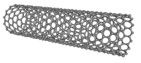 Другие области применения фуллеренов Среди других интересных приложений следует отметить аккумуляторы и электрические батареи, в которых так или иначе используются добавки фуллеренов. Основой этих аккумуляторов являются литиевые катоды, содержащие интеркалированные фуллерены. Фуллерены также могут быть использованы в качестве добавок для получения искусственных алмазов методом высокого давления. При этом выход алмазов увеличивается на ≈30 %. Фуллерены могут быть также использованы в фармации для создания новых лекарств. Кроме того, фуллерены нашли применение в качестве добавок в интумесцентные (вспучивающиеся) огнезащитные краски. За счёт введения фуллеренов краска под воздействие температуры при пожаре вспучивается, образуется достаточно плотный пенококсовый слой, который в несколько раз увеличивает время нагревания до критической температуры защищаемых конструкций. Так же фуллерены и их различные химические производные используются в сочетании с полисопряжёнными полупроводящими полимерами для изготовления солнечных элементов. Наконец, фуллерены могут найти применение в медицине. В 1991 японский профессор Сумио Иидзима обнаружил длинные углеродные цилиндры, получившие название нанотрубок. Нанотрубка - это молекула из более миллиона атомов углерода, представляющая собой трубку с диаметром около нанометра и длиной несколько десятков микрон. В стенках трубки атомы углерода расположены в вершинах правильных шестиугольников (рис.26).