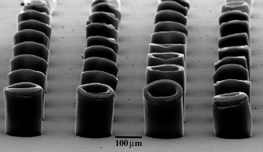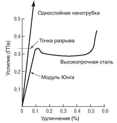 Рис.26. Эти изумительные нанотрубки в 100 тыс. раз тоньше человеческого волоса и оказались на редкость прочным материалом! Нанотрубки в 50-100 раз прочнее стали и имеют в шесть раз меньшую плотность! Модуль Юнга ~ уровень сопротивления материала деформации - у нанотрубок вдвое выше, чем у обычных углеродных волокон. То есть трубки не только прочные, но и гибкие, и напоминают по своему поведению не ломкие соломинки, а жесткие резиновые трубки. Под действием механических напряжений, превышающих критические, нанотрубки ведут себя довольно экстравагантно: они не "рвутся", не "ломаются", а просто-напросто перестраиваются!