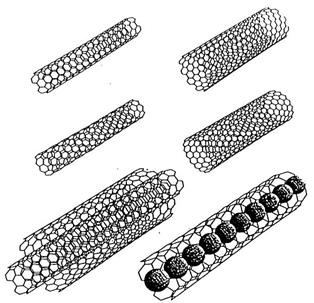 Рис. 27 Диаграмма прочности нанотрубок по сравнению с высокопрочной сталью Модуль Юнга – уровень сопротивления материала деформации – у нанотрубок вдвое выше, чем у обычных углеродных волокон. То есть трубки не только прочные, но и гибкие, и напоминают по своему поведению не ломкие соломинки, а жесткие резиновые трубки. Под действием механических напряжений, превышающих критические, нанотрубки ведут себя довольно экстравагантно: они не “рвутся”, не “ломаются”, а перестраиваются! Эти необычные свойства нанотрубок можно использовать для создания искусственных мускулов, которые при одинаковом объеме могут быть вдесятеро сильнее биологических, не боятся высоких температур, вакуума и многих химических реагентов. Из нанотрубок можно создать сверхлегкие и сверхпрочные композиционные материалы, чтобы шить из них одежду, не стесняющую движений, для пожарных и космонавтов. Нанокабель от Земли до Луны из одиночной трубки можно было бы намотать на катушку размером с маковое зернышко. Небольшая нить диаметром 1 мм, состоящая из нанотрубок, могла бы выдержать груз в 20 т, что в несколько сотен миллиардов раз больше ее собственной массы! Правда, в настоящее время максимальная длина нанотрубок составляет десятки и сотни микрон – что, конечно, очень велико по атомным масштабам, но слишком мало для повседневного использования. Однако длина получаемых нанотрубок постепенно увеличивается сейчас ученые уже вплотную подошли к сантиметровому рубежу. Получены многослойные нанотрубки длиной 4 мм. Поэтому есть все основания надеяться, что в ближайшем будущем ученые научатся выращивать нанотрубки длиной в метры и даже сотни метров. Безусловно, это сильно повлияет на будущие технологии: ведь невидимый невооруженным взглядом “трос” в тысячи раз тоньше человеческого волоса и способный удерживать груз в сотни килограмм найдет бесчисленное множество применений. Это открывает возможность создания материалов для авиационно-космического комплекса с уникальными механическими свойствами. Нанотрубки бывают самой разной формы: однослойные и многослойные, прямые и спиральные. Кроме того, они демонстрируют целый спектр самых неожиданных электрических, магнитных, оптических свойств. Разновидности нанотрубок (рис.28):