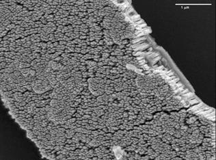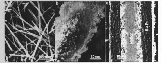 Пустоты внутри фуллеренов и нанотрубок давно привлекали внимание ученых. Эксперименты показали, что если внутрь фуллерена внедрить атом какого-нибудь вещества (этот процесс носит название “интеркаляция”, т.е. “внедрение”), то это может изменить его электрические свойства и даже превратить изолятор в сверхпроводник. Таким же образом можно изменить свойства нанотрубок. Ученые смогли поместить внутрь нанотрубки целую цепочку из фуллеренов с уже внедренными в них атомами гадолиния. Электрические свойства такой необычной структуры сильно отличались как от свойств простой, полой нанотрубки, так и от свойств нанотрубки с пустыми фуллеренами внутри. Интересно отметить, что для таких соединений разработаны специальные химические обозначения. Описанная выше структура записывается как Gd@C60@SWNT, что означает “Gd внутри C60 внутри однослойной нанотрубки (Single Wall NanoTube)”. На рис. 30 приведено СЭМ изображение Ru-Pt Nafion композитных нанотрубок: