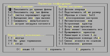 Программа Midnight Commander имеет ряд установок (опций), каждая из которых может быть включена или выключена, для чего служат несколько диалоговых окон, доступных через меню Настройки. Опция включена, если поставлена (с помощью клавиши пробела) звездочка или знак "x" в скобках перед названием опции. Рассмотрим последовательно команды меню Настройки, через которое включаются / отключаются эти опции.