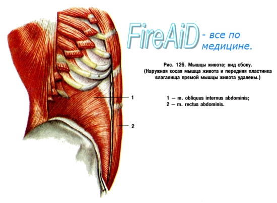 2. M. obliquus internus abdominis, внутренняя косая мышца живота, лежит под предыдущей мышцей. Она берет начало сзади от fascia thoracolumbalis, затем от подвздошного гребня и от латеральных двух третей паховой связки. Направление волокон мышцы в общем восходящее, веерообразное. Задние пучки мышцы, восходя кверху, прикрепляются к нижнему краю XII, XI и X ребер. Продолжением их между ребрами служит mm. intercostales interni. Передние пучки мышцы переходят в широкий апоневроз, который по латеральному краю m. rectus расщепляется на два листка, принимающих участие в образовании влагалища названной мышцы (об этом см. ниже). Медиально от m. rectus, по linea alba апоневроз соединяется с таким же апоневрозом противоположной стороны. М. obliquus internus abdominis со своей наружной и внутренней поверхности покрыт фасциальными пластинками. (Инн. ГАуш-хн и J-\-Nn. intercostales X —XII, iliohypogastricus et ilioinguinalis.) 3. M. transversus abdominis, поперечная мышца живота, — самая глубокая и тонкая из всех широких брюшных мышц. Она начинается от внутренней поверхности шести нижних ребер. Выше диафрагмы продолжение ее составляет m. tranversus thoracis. Далее книзу и кзади мышца берет начало от глубокого листка fascia thoracolumbalis и, наконец, в самом низу от подвздошного гребня и латеральных двух третей паховой связки. От этих мест своего начала волокна мышцы идут поперечно кпереди и медиально и переходят в широкий апоневроз, который направляется к linea alba в верхнем своем отделе позади, а в нижнем впереди m. rectus abdominis, и соединяется с апоневрозом противоположной стороны. У многих млекопитающих эта мышца развита сильнее и может втягивать яичко в полость тела из мошонки. У человека от внутренней косой и поперечной мышцы к яичку отходит лишь небольшой мышечный пучок — рудиментарная мышца, поднимающая яичко, m. cremaster. На внутренней своей поверхности, обращенной в брюшную полость, поперечная мышца живота покрыта fascia transversalis, представляющей участок общей под-брюшинной фасции, fascia subperitonealis. Последняя выстилает всю внутреннюю поверхность брюшных стенок и местами носит отдельные названия соответственно области расположения: fascia transversalis, fascia iliaca, fascia pelvis и т.д. (Инн. Nn. intercostales — VII—XII, ilio-hypogastricus et ilioinguinalis.) <P >Передние мышцы. М. rectus abdominis, прямая мышца живота, лежит на обеих сторонах сбоку от средней линии и состоит из продольных мышечных пучков, идущих в вертикальном направлении. Она начинается от передней поверхности V, VI и VII реберных хрящей и от мечевидного отростка грудины, затем, постепенно суживаясь, направляется вниз иприкрепляется крепким сухожилием к лобковой кости на пространстве между симфизом и tuberculum pubicum. Низкое начало прямой мышцы в сравнении с животными, как уже говорилось, обусловлено расширением у антропоморфных обезьян и у человека грудной клетки, ставшей опорой для развившейся мускулатуры верхней конечности в связи с брахиацией (у обезьян) и трудом (у человека). На своем протяжении мышца прерывается идущими поперечно (3—4) сухожильными перемычками, intersectibnes tendineae. Перемычки срастаются с передней стенкой влагалища, в котором расположен m. rectus. Intersectiones tendineae представляют следы бывшего сегментарного развития вентральной мускулатуры. Они имеют и функциональное значение: разделяя мышцу на отдельные сегменты, они дают возможность каждому из них сокращаться самостоятельно. (Инн. Nn. intercostales.) 2. М. pyramidalis, пирамидальная мышца, небольшой мышечный треугольник, залегающ