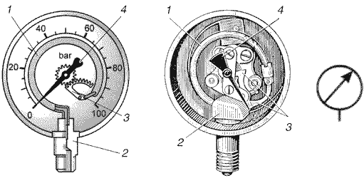 Рис.7.32. Деформационные манометры: В мембранный манометрах давление со стороны рабочей жидкости передается на мембрану (рис.7.32, а, б, в). На мембране установлены тензорезисторы, которые изгибаясь вместе с мембраной изменяют свое электрическое сопротивление. Изменение сопротивления регистрируется электрическими приборами и преобразуется в показания значения соответствующего давления. В сильфонных манометрах (рис.7.32, г) давление рабочей жидкости приводит к растяжению гофрированной упругой трубки пропорционально давлению. Мембранный и сильфонные манометры предназначены для измерения небольших давлений. Пружинный манометр (рис.7.33) имеет пружину в виде изогнутой латунной трубки (трубка Бурдона) 1 эллиптического поперечного сечения. Верхний конец трубки запаян, а нижний припаян к штуцеру 2, через который манометр присоединяется в гидросистему. При заполнении трубки рабочей средой под давлением она стремится выпрямиться. Через рычажный механизм 3, усиливающий деформацию трубки, перемещение ее свободного конца передается на стрелку 4, расположенную по центру шкалы прибора. Пружинные манометры просты по конструкции, ими можно измерять давление в широком диапазоне.