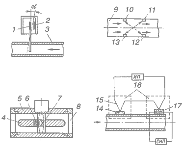 Рис.7.35. Схемы расходомеров: В струйных расходомерах (рис.7.35, а) на пути рабочей жидкости в трубопроводе 3 располагается некоторое препятствие типа плоской мембраны 1, отклонение которой является функцией скорости струи, а регистрирующий ток - функцией взаимного положения мембраны 3 и неподвижного электрода 2. Тахометрические турбинные расходомеры (рис.7.35, в) работают с малогабаритными электронными преобразователями. В таком расходомере поток рабочей жидкости приводит во вращение турбину, каждый проход лопасти которой наводит импульс ЭДС в обмотке индукционного преобразователя. Скорость потока определяется через частоту электрических импульсов на выходе преобразователя путем как непосредственного измерения, так и выводом на цифровые приборы или преобразованием в аналоговый сигнал. Такими расходомерами можно измерять расходы до 360 л/мин. Ультразвуковые расходомеры (рис.7.35, б) работают на основе ультразвуковых колебаний. Благодаря эффекту Доплера частота и фаза ультразвукового сигнала, проходящего от излучателя 11 к приемнику 13, будет изменяться в функции скорости протекания рабочей жидкости. Введение дополнительной пары излучатель 10 - приемник 12 обеспечивает компенсацию температурной нестабильности. Тепловой неконтактный расходомер применяется для определения подачи насосом рабочей жидкости без разборки гидросистемы (рис.7.35, г). Он имеет стабилизированный источник питания (СИП), датчик и измерительный прибор (ИП). СИП обеспечивает питание нагревателя и ИП, включающий в себя дифференциальную термопару, позволяет определить скорость потока рабочей жидкости по разности температур входящего потока рабочей жидкости и нагревателя. Измерение температуры. Температуру рабочей жидкости в гидроприводах измеряют термометрами, которые по принципу действия делятся на термометры расширения, сопротивления и теплоэлектрические. При диагностировании гидроприводов наибольшее распространение получили термометры расширения, имеющие границы измерений от -60 до +250 С. Измерение крутящего момента на валах гидромашин определяют балансирными динамометрами или торсионометрами, первые из которых получили наибольшее распространение. Балансирные динамометры бывают электрические, тормозные, гидравлические и механические.