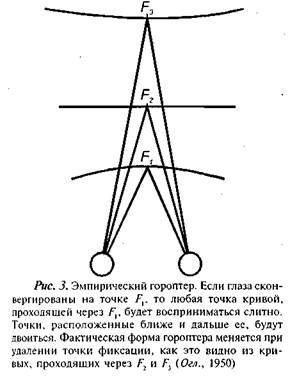 Гороптер Для полноты изложения мы должны упомянуть о гороптере: Это геометрическое место всех точек пространства, которые дают недиспаратные изображения при данной степени конвергенции. Допустим, фиксируется объект на расстоянии 3 л от головы. Фиксируемый объект будет казаться слитным, так как глаза сконвергированы на нем, обеспечивая попадание его изображения на корреспондирующие фовеальные точки обоих глаз. Объекты, находящиеся ближе и дальше точки фиксации, но на той же линии взора, будут давать двоящиеся изображения, так как они стимулируют некорреспондируюшие точки сетчаток. Рассмотрим теперь объекты, лежащие в стороне от точки фиксации на периферии поля зрения. Насколько они должны быть удалены, чтобы стимулировать корреспондирующие точки и восприниматься слитно? На первый взгляд может показаться, что все точки, лежащие на одинаковом расстоянии от глаз, в нашем примере на расстоянии 3 м, должны видеться слитно, т. е. что гороптер будет сферической поверхностью с радиусом Зли центром у переносицы. Однако это оказывается совершенно неверным. Геометрически можно показать, что теоретической формой гороптера является окружность, проходящая через точку фиксации и центры вращения обоих глаз. Однако при экспериментальной проверке и это оказывается неверным из-за определенных усложняющих факторов в самих глазах. Экспериментальное определение действительного, или эмпирического гороптера просто в теории, но утомительно на практике. Испытуемый должен удерживать фиксацию на одном стержне и подбирать положение другого в разных точках периферии до тех пор, пока они не будут видеться слитно (рис. 3). Как оказывается, действительная форма гороптера меняется вместе с удалением точки фиксации.