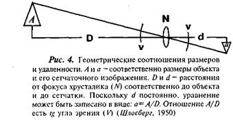 Знание гороптера важно для полного математического анализа определенных аспектов восприятия глубины (Гельмгольц, 1925; Огл., 1950), но для большинства из нас, к счастью, достаточно поверхностного знакомства с этим сложным вопросом. Двигательный параллакс В общем случае параллакс — это изменение положения объекта, вызванное изменением положения наблюдателя. Бинокулярный параллакс обусловлен небольшим различием в положении обоих глаз. При смещении головы на 15 ел в сторону имеет место значительно больший параллакс. Такое смещение дает очень разные картины объекта, но поскольку они не одновременны, отчетливого стереоскопического бинокулярного эффекта при этом получить невозможно. Однако во время движения мы, действительно, получаем ясные впечатления об относительной скорости объектов. Когда мы смещаемся вправо, все объекты движутся влево, однако угловое смещение отдаленных объектов значительно меньше, чем ближних (чисто геометрический эффект). Глаза наблюдателя не остаются пассивными при движении головы или тела. Они фиксируют некоторый объект и удерживают фиксацию на нем с помощью компенсаторных прослеживающих движений. Если фиксировать объект, находящийся на среднем расстоянии и при этом двигать голову вправо, то изображения всех более близких объектов будут перемещаться по сетчатке в одном направлении, а всех более далеких — в противоположном. Все далекие объекты как бы следуют за вами, тогда как ближние перемещаются вам навстречу. При этом чем ближе объект, тем "больше скорость его относительного встречного движения. Наоборот, чем объект дальше, тем больше скорость его относительного сопровождающего движения. Мы не знаем, насколько используется этот великолепный признак глубины. В лесу или в другом подобном месте расстояния как бы оживают, как только мы начинаем двигаться. При быстрой езде на автомобиле оживают даже дали. Размер как признак глубины Знакомый размер объекта является хорошим признаком его удаленности. Этот признак, как и рассмотренные нами выше, базируется па свойствах треугольника. На рис. 4 действительный размер объекта —A, D — его удаленность, а — величина сетчаточ-ного изображения, d — расстояние от точки пересечения всех лучей (центра линзы) до сетчатки. Таким образом, мы имеем два подобных треугольника, в которых ajd =A/D. Когда человек смотрит на объект, размеры and заданы, даже если он этого неосознает. Размер его глазного яблока можно принять за единицу; тогда из уравнения следует, что а = A/D. Величина сетчаточного изображения, по-видимому, как-то регистрируется нервной системой. Если человек знает реальный размер (А) объекта, он может, решив уравнение, получить расстояние до него (D). Поскольку мы, действительно, знаем размеры многих объектов, вполне возможно, что мы пользуемся этим при оценке расстояний. Сюда же относятся многие признаки, используемые художниками для изображения глубины. Относительный размер, линейная перспектива, положение в поле зрения — все это может быть сведено к той же самой основной формуле. Например, железнодорожные шпалы представляют собой серию объектов известного (и одинакового) размера, дающих постепенно уменьшающиеся ретинальные изображения. Поскольку А остается постоянным, а а уменьшается, из уравнения следует увеличение D. Таким образом, полотно воспринимается ух