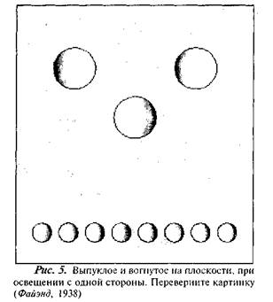 Наложение или перекрытие Невозможность увидеть что-либо за углом — одна из самых простых истин зрительного опыта, истина, которую очень рано понимает ребенок. Он обучается тому, что один объект может быть скрыт за другим, что закрытый объект находится дальше и что часто можно увидеть скрытый объект, сдвинувшись вправо или влево. Таким образом, сочетая принципы наложения и двигательного параллакса, он может познакомиться с другими признаками глубины. Когда дальний объект лишь частично закрыт ближним, их общий контур может указать, какой из них ближе, без всякого перемещения наблюдателя и без предварительного знакомства с ними (Ратуш, 1949). Более законченная фигура также кажется находящейся ближе (Чапанис и Мак-Клери, 1953). В определенных ситуациях наложение является единственно надежным признаком относительного расстояния; например, при полевой стрельбе, если взрыв снаряда закрывает цель, прицел дал "недолет", если же цель выступает на фоне взрыва, то произошел "перелет". Когда Шривер (1925) "сталкивал" между собой признаки глубины, перекрытие оказалось самым сильным из них. Солнечное затмение означает, что Луна находится между Солнцем и Землей. Тени Еще одним признаком глубины и рельефа, широко используемым художниками, является тень, падающая на сферическую или ребристую поверхность. Тень, отбрасываемая одним объектом на другой, показывает, какой из них дальше, обнаруживая при этом положение источника или направление света. Ложные тени или ложные источники света могут вызывать очень интересные эффекты, например, превращение выпуклого рельефа в вогнутый и обратно. Воронки от снарядов, снятые с воздуха, выглядят как горы, если перевернуть фотографию вверх ногами. Известно также множество других примеров. Простой рис. 5, если его показать многим испытуемым, обнаружит ряд характерных фактов: 1) обычно кажется, что свет на картину падает сверху; 2) выпуклое видится чаще, чем вогнутое; 3) есть тенденция видеть рельеф всех фигур одинаковым.