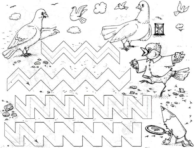 Покажи, как скачет воробышек: одну линию проведи по пунктиру, а другую продолжи самостоятельно. Воробышек скачет и чирикает: «Чи-чик -чирик».
