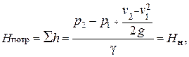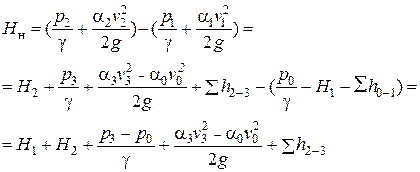 Энергия, которая сообщается жидкости насосом, носит название напора, создаваемого насосом, и обозначается Н Н. Чтобы найти напор насоса, найдем разность удельных энергий в сечениях 1-1 и 2-2: