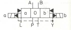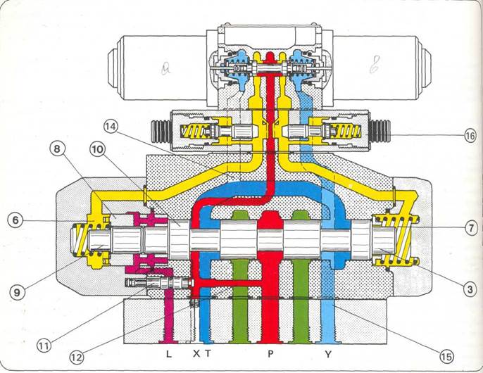 Если включить правый магнит распределителя, то поршень предварительного управления движется влево. Полость 6 по-прежнему соединена с магистралью давления управления, а полость 7 разгружена в направлении бака. Центрирующая втулка 8 прилегает к корпусу, а центрирующий винт 9 передвигает основной поршень вправо до упора. Пружины в полостях 6 и 7 служат для удержания поршня в нейтральном положении при отсутствии давления управления, если, например, клапан установлен в вертикальном положении. При отключении правого магнита поршень предварительного управления возвращается назад в нейтральное положение. Полость 7 вновь соединяется с магистралью давления управления. Площадь 3 поршня больше площади центрирующего винтаЩ. Основной поршень движется влево до тех пор, пока перемычка 10 не упрется в центрирующую втулку. Площади центрирующей втулки и винта превышают площадь поршня 3. Поршень останавливается в нейтральном положении. При включении левого магнита поршень смещается вправо. Полость 7 по-прежнему соединена с линией давления управления, в то время как полость 6 разгружена. Благодаря тому, что на площадь 3 действует давление, основной поршень движется влево до тех пор, пока центрирующий винт 9 не упирается в крышку. Центрирующая втулка 8 также смещается. Главный распределитель находится в заданном положении. При отключении левого магнита поршень предварительного управления возвращается в нейтральное положение. А полость 6 снова соединена с линией давления управления. Площади центрирующей втулки 8 и винта 9 превышают площадь поршня 3. Основной поршень перемещается вправо до тех пор, пока центрирующая втулка не упирается в корпус. Теперь площадь правой поверхности поршня 3, движущегося вправо, больше площади левой поверхности центрирующего винта 9, давящего влево. Поршень останавливается в нейтральном положении. Для разгрузки полости между основным поршнем и центрирующей втулкой имеется окно утечки, обозначенное фиолетовым цветом.