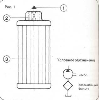 Фильтрующий элемент имеет резьбовое подключение 2. Жидкость из насоса всасывается через фильтроэлемен-том 3. Очищенная рабочая жидкость попадает в гидросистему 1. Недостатком такого фильтра является то, что доступ к нему и, следовательно, уход затруднен. Кроме того, всасывающий фильтр мешает всасыванию рабочей жидкости насосом. Следует особо учесть тот факт, что по этой причине всасывающие фильтры не могут устанавливаться на насосах определенных типов. Тонкость фильтрации всасывающего фильтра обычно составляет > 100 мкм.