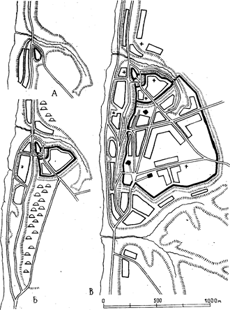 Рост территории Рязани в ее историческом развитии. А — Северный мыс («Кром») — с середины XI в.; Б — «Кром» и Северное городище (Средний город) — с середины XI в. по 1237 г. С этой ранней частью города связан обширный курганный могильник; В — Южное городище (Столичный город) — с середины XII в. по 1237 г. Вдоль главных улиц и на подоле обозначены участки наиболее интенсивной застройки {50}