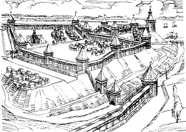 Появление укреплений Среднего города. Маленький городок на мысу уже не может вместить возрастающее население Мурома. Прекращается зависимость рязанских земель и от Чернигова. И хотя главный стол еще находился в Муроме, но появление в Рязани собственных князей предвещало ее обособление в самостоятельный город-государство. С усилением Рязани связан рост городской территории и возведение нового пояса укреплений. Как былинный град, она отныне стоит «широкими рвами окопавшися, земляным валом огородившися». Треугольный в плане город площадью около 10 га со стороны поля был защищен дугообразно изогнутым валом из желтой материковой глины, концы которого направлены к берегам Оки и Серебрянки. Перед ним хорошо сохранился ров. Деревянные конструкции в самом валу не прослежены, но на гребне насыпи могли возвышаться срубные стены с боевыми площадками-заборолами. Такая же стена шла по всему периметру города над естественными, почти отвесными склонами. Труднодоступная крепость {53} могла выдержать организованную осаду. В то время укрепления брали или «изъездом» — неожиданным захватом, когда защитники не успевали приготовиться к обороне, или же «облежанием» — пассивной осадой. Она продолжалась до тех пор, пока осажденные не сдавались, измученные голодом и жаждой. Прямой штурм укреплений применяли редко — только в тех случаях, когда они были заведомо слабыми. На месте проезда в валу, через который проходит современная дорога, стояла деревянная башня-вежа со «Спасскими» воротами в нижней части. Перед ней через ров был перекинут узкий мост, уничтожавшийся в момент опасности. Вторая воротная башня, к которой уступами спускались стены, находилась значительно ниже — у северного въезда со стороны Оки («Серебряные» или «Золотые» ворота). Нынешняя дорога, пересекающая городище, проходит по трассе древней улицы. Археологи назвали первичное ядро города Северным городищем, на чертеже первой половины XIX в. оно обозначено как «Площадь малой крепости». За минувшие века края высокого берега пострадали от оползней, так что остатки укреплений осыпались. Высота расплывшегося вала не превышает 3,5 м при длине 235 м. Но по сохранившимся следам укреплений и рельефу местности можно судить о системе обороны Рязани до середины XII в. Между городскими стенами и Окой ближе к воде уже вырос «подол» — неукрепленное предградье, расположенное на первой надпойменной террасе. Подол простирался от слобод «Задола» и «Пешей» у подножия Северного городища до места современного парома под Соколиной горой, где в XIX — начале XX в. стояла усадьба помещиков Стерлиговых. У места впадения Серебрянки открыта древняя пристань: дубовые сваи и настилы причала залегали на глубине свыше метра и тянулись вдоль берега примерно на 30 м. Некогда к «пристанищу» причаливали суда, приспособленные как для боевых действий, так и для перевозки товаров: караваны ладей с весельным ходом и квадратным парусом-ветрилом на мачте, вмещавших до 40 «мужей», «насады» — ладьи с высокими надставными бортами, перекрытые палубой для защиты гребцов от стрел, плоскодонные парусные корабли с грузоподъемностью до 40 т. Реку бороздили рыбацкие челны-однодеревки, выдолбленные из стволов толстых деревьев и поверху обшитые досками-нашвами. Рязанцы встречали и флотилии маневренных бо-{54}евых судов, подобных «дл