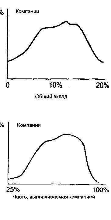 И наконец - размеры. На самом деле тут два вопроса: сколько в общем и какая часть этого общего будет вкладом компании. Первое- сколько в общем? Беря за минимум 5% от общего жалованья компании и 20% как самую щедрую сумму, мы видим на этом графике, как оценивается распределение для компаний, где меньше 50 служащих. Как видите, отчисления свыше 16% довольно редки, а большая часть компаний попадает в интервал от 8% до 16%. И второе - какая часть? Второй график показывает, какая доля в процентах является вкладом самой компании; вы видите, что большая часть компаний попадает в интервал от 65 до 75 процентов. Я сейчас раздам вам экземпляры этих схем. Сообщите людям, что им дадут копии, иначе кто-то начнет зарисовывать для себя график и пропустит ваши слова.
