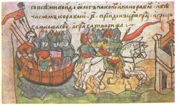 Поход Руси на Константинополь в 907 г. Поход Олега на Византию. После бурных событий 60-х гг. IX в. Русь на некоторое время отступает в тень. Не слышно ее голоса на международной арене. Молчит ее дипломатия. Но Русь не замирает; идут бурные социально-экономические процессы, развивается древнерусская государственность. Именно после 860 г. объединяются в политическое целое север и юг страны — новгородская и киевская земля. Создается политическое ядро восточнославянских земель, к которому одно за другим присоединяются племенные союзы иных восточных славян. Эти события были связаны с походом Олега на юг. Двигаясь из Новгорода во главе большого войска, состоявшего из варягов, новгородских словен, кривичей и неславянских воинов — мери, веси, чуди, он захватил Смоленск, Любеч и появился под Киевом. Княжившие там Аскольд и Дир были убиты, и Олег остался в Киеве, сделав его центром своего государства. «Се буди мати градомъ русьскимъ», — будто бы заявил он. Об этом сообщает «Повесть временных лет». В дальнейшем Олег присоединил к себе земли древлян, северян, радимичей и, таким образом, объединил под властью Киева все основные русские племенные союзы. Он освободил северян и радимичей от платы дани хазарам. Лишь вятичи, не вошедшие в состав Руси, продолжали находиться в зависимости от Хазарского каганата. Таким образом, не только решались внутриполитические задачи объединения восточнославянских племенных союзов в единое Русское государство, но и шел процесс освобождения русских земель от иноземного ига, креп государственный суверенитет Руси. В это же время для дальнейшей стабилизации международных позиций Руси молодому единому государству пришлось заключить два дипломатических соглашения: одно — с варягами, другое — с венграми. Варяги — жители южных берегов Балтийского моря, возможно, славянского происхождения, как доказывают некоторые отечественные, в том числе и советские, историки, ближайшие соседи новгородских славян, чуди, веси и других северных племен — издавна нападали на новгородские земли и даже возложили дань на новгородских славян. Однако затем варяжское засилье было сброшено, дань ликвидирована. Но, согласно летописи, в славянских землях начались междоусобицы, что привело к тому, что новгородцы послали к соседям гонцов с просьбой прислать им князя, так как в их земле нет «наряда», идет смута. В так называемой Иоакимовской летописи, сведения которой отразились в труде историка XVIII в. В. Н. Татищева, указывалось, что призвание новгородцами князя со стороны объяснялось династическим кризисом, отсутствием наследника у умершего новгородского князя и обращением новгородцев к его родственникам из прибалтийских славян. Не вдаваясь в смысл легенды о «призвании» варягов, заметим, что и позднее приглашение князя со стороны оставалось новгородской традицией. Князь командовал войском, охранял земли Новгородского княжества. Нет никакого сомнения в том, что государство зародилось здесь задолго до призвания варягов. Вспомним, что Новгородцы во главе с Бравлином ходили на Херсонес и Сурож еще в IX в. Рюрик, а затем Олег, видимо, содействовали стабилизации власти в новгородских землях. В 882 г Олег объединил Новгород и Киев. Но варяги не отказались от набегов на северо-западные русские земли, и тогда, чтобы превратит! опасных соседей в союз