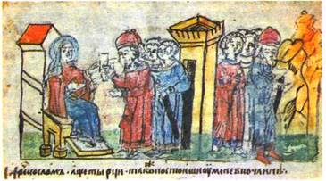 Летом 957 г. огромное русское посольство во главе с великой княгиней двинулось в Константинополь. Состав посольства, не считая охраны, корабельщиков, слуг, перевалил за сотню. В свиту княгини входил ее ближайший родственник — Анепсий, как его называли греки, занимавший в посольстве второе место после Ольги, 8 ее приближенных — знатных бояр или родственников, 22 знатных русса, члены посольства, 44 торговых человека, люди Святослава, священник Григорий, 8 человек свиты послов, 2 переводчика, а также приближенные женщины княгини. Столь пышного, столь представительного посольства Русь в Византию еще не засылала. Русская флотилия прибыла в константинопольскую гавань, а далее начались осложнения. Император впервые принял Ольгу лишь 9 сентября, т. е. тогда, когда русские караваны обычно собирались в обратный путь. Около двух месяцев руссы ожидали приема. Позднее Ольга вспомнит об этом в Киеве, когда к ней придут послы из Византии, в гневе она скажет им: «...постоиши у мене в Почайне (в киевской гавани, в устье реки Почайны, впадающей в Днепр. — А. С), яко же азъ в Суду (в константинопольской гавани. — А. С.)...» Русская княгиня не забыла о долгом стоянии в «Суду» и по прошествии нескольких месяцев. В чем же дело? Почему такое неуважение было оказано желанной гостье и союзнику? Ответ заключается в порядке двух приемов русской княгини в императорском дворце — 9 сентября и 18 октября, которые подробно описал Константин VII в своем труде «О церемониях». Этот порядок вышел далеко за рамки обычного, не имел аналогий во время встреч с другими иностранными представителями и никак не соответствовал византийскому церемониалу, за который свято держалась византийская империя и особенно Константин VII, блюститель и хранитель вековых традиций. Обычно любой, кто приближался к трону византийских императоров, совершал проскинесис — падал ниц к императорским стопам, но ничего подобного не произошло с Ольгой: 9 сентября она без сопровождения подошла к трону, лишь легким наклоном головы приветствовала Константина VII и стоя беседовала с ним. Затем она была принята императрицей.