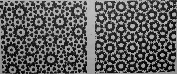 С развитием фотовыводных устройств появилась возможность применять растровые точки разной конфигурации. Конфигурация растровой точки влияет на характеристики оттиска. В современной полиграфической технике применяется множество разновидностей растровых точек, но наиболее популярны круглая, квадратная, эллиптическая, эвклидова. Круглая растровая точка рекомендована для воспроизведения фотоснимков, квадратная — для сюжетов, требующих повышенной четкости, эллиптическая — для сюжетов с изображением людей, эвклидова — для черно-белой печати. Один из важнейших параметров регулярного растра — линиатура — измеряется в линиях на сантиметр [лин./см] или в линиях на дюйм [LPI]. Для каждой группы полиграфической продукции рекомендуется своя линиатура: 12-25 лин./см для крупноформатных плакатов способом гигантотипии; 25-40 лин./см для газетного производства; 40-60 лин./см для журналов и рядовой полиграфической продукции; 60-80 лин./см для высококачественной рекламной продукции; более 80 лин./см для специальных областей полиграфии, например, для защиты ценных бумаг. Пожалуй, самое ценное качество растров проявилось, когда было изобретено цветоделение. Первоначально цветоделение представляло собой фотографирование цветного оригинала через светофильтры: красный, синий, желтый с использованием растра. При этом получались цветоделенные растрированные изображения. Затем с каждого такого изображения получали печатную форму и печатали соответствующими красками. Но при наложении регулярных растров друг на друга получается вторичный рисунок — муар, который портит общую картину оттиска и вносит серьезные искажения в цветопередачу. Муар получается в результате интерференции между регулярными структурами — растровыми точками, расположенными регулярно. Избавиться от муара нельзя, можно только уменьшить заметность муара. Достичь этого можно или увеличивая линиатуру растра, или поворачивая растры относительно друг друга. В четырехкрасочной печати существует так называемый розеточный муар. Это своеобразный узор, образованный растровыми точками, который ровным рисунком покрывает весь оттиск. Такой муар можно увидеть при увеличении на каждом цветном оттиске, отпечатанном с помощью регулярного растра (рис. 17.3).
