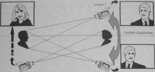 Правило монтажа по крупности: в комфортном монтаже нельзя сталкивать соседние крупности, оптимальный монтаж — через крупность. Например, средний второй — крупный третий, но никак не общий первый — средний третий или общий третий — крупный первый. Исключения: крупный план монтируется с деталью, общий план с дальним. Особыми с точки зрения крупности являются кадры, для которых невозможно использовать в качестве масштаба человеческую фигуру. Это кадры, снятые с использованием специальной оптики. Макросъемка (аналогична использованию человеком лупы), когда надо показать нюансы, видимые человеческим глазом, но для экрана нуждающиеся в увеличении (например, поры на коже). Микросъемка (аналогична использованию человеком микроскопа), когда надо показать объекты, невидимые человеческим глазом (например, микробы). Кроме того, иногда необходимо выделить часть какого-либо предмета или часть тела (циферблат часов или человеческий глаз), такая крупность называется «деталью». Использование деталей в комфортном монтаже должно быть оправдано предшествующим действием. Например, герой смотрит на часы или наклоняется к микроскопу. Когда нет возможности точно следовать принципу комфортного монтажа по крупности, нужно помнить, что длительностью планов можно сгладить скачок крупности, то есть чем длиннее план, тем мягче будет переход к соседней крупности. Еще одна рекомендация. Чтобы монтажный стык выглядел на все 100%, на съемке при переходе со среднего плана на крупный, приблизившись к объекту на пару шагов, нужно сделать также шаг в Сторону. При этом слегка изменится ракурс и фон за героем, что тоже благоприятно отразится на восприятии склейки. Чем сильнее смещена точка съемки, тем меньшее изменение крупности требуется для чистой склейки. В этом случае иногда крупность можно вообще не менять. Важным условием комфортного монтажа является использование адресного плана — экспозиционного, установочного плана, который знакомит зрителей с местом действия и показывает взаиморасположение всех героев. Адресные планы по причине своей функции обычно бывают общими или средними. Они редко обладают той же композиционной энергией и динамикой, что и крупный план. Поэтому, после того как вы заявили место действия в адресном плане, стандартный прием предусматривает переход на крупный план. И наоборот, после того как с помощью перехода на крупный план вы познакомили зрителей с существенной деталью, часто необходимо выполнить обратный переход на общий план, особенно если начинается действие. Монтаж по географии (ориентации в пространстве). Между любыми двумя людьми, находящимися в кадре, можно мысленно провести линию, повторяющую направления их взглядов друг на друга. Такая линия, называемая линией общения (или линией взаимодействия), является главным критерием комфортного монтажа по принципу географии. Все точки съемки должны находиться только по одну ее сторону. Пересекать ее можно только в одном случае, когда кадр начинается по одну ее сторону, а заканчивается по другую, иначе монтажный перескок разрушит представление о пространстве у зрителя, который во время беседы двух людей увидит два однонаправленных профиля и кадры не смонтируются (см. рис. 24.1).