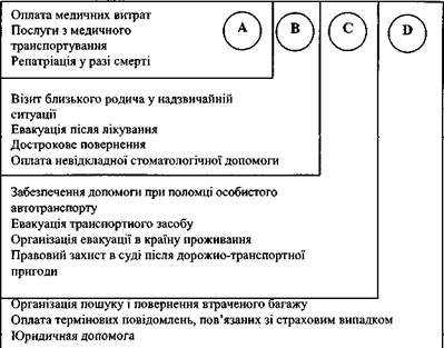 Рис. 8.1. Поділ ризиків по страхованию в системі «Асістанс» компанії Coris Порівняння послуг даних компаній показує, що в цілому вони ідентичні, але зміщений акцент кодів ризиків С і D. Яким умовам варто віддавати перевагу, слід вирішувати кожного разу залежно від виду поїздки, передбачуваних ризиків, а також беручи до уваги додаткові умови: ціну, знижки, обмеження. Як показує практика, до 80% полісів по страхуванню медичних послуг реалізується через туристичні фірми, з якими в страхових компаніях укладені відповідні договори. Безпосередньо в страхових компаніях поліси купують ті мандрівники, які бажають їздити за кордон самостійно.