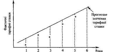 За деякими даними, імовірність страхового випадку з туристом ще вища. Так, у цьому ж джерелі [9] інший фахівець зі страхування дає таку оцінку імовірності: у групі з двадцяти туристів відбувається два-три випадки, коли необхідна організація і відповідно оплата невідкладної допомоги. Причому зростання кількості важких травм, захворювань, що вимагають тер- мінового і дорогого оперативного втручання і медичних транспортувань, відзначається всіма страховиками, які страхують туристичні ризики. Якщо страхова компанія успішно функціонує протягом достатньої кількості років, за кожний такий рік можна оцінити фактичні тарифні ставки, що забезпечують фінансову стійкість її страхових операцій і, крім того, динаміка їх зміни має виражену тенденцію, то можна застосувати трендовий аналіз для визначення тарифної ставки на майбутній період. Це більш точний метод, ніж попередній. Суть його в тому, що за фактичними тарифними ставками за попередні роки будують рівняння регресії або тренд і иа їхній основі прогнозують тарифну ставку на майбутній період (рис. 12.3).