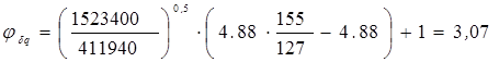 Итоговое напряжение изгиба в теле трубы определяем по формуле (4.13): σзм = 3,07 *26,7=81,9 МПа. Если диаметр замка равен 165,1 мм, то произойдет увеличение критической нагрузки Тс 2, который станет равным 559062 Н, коэффициент φδq тоже изменится в большую сторону и напряжение изгиба достигнет величины 91,0 МПа. Определим запас прочности на разрыв в верхнем сечении седьмого участка с учётом влияния изгибных напряжений. Выше было найдено (разд. 4.4), что для этого сечения Qв 7 = 1616 кН (с учётом гидравлической силы) и σ = 475,3 МПа. Тогда эквивалентное напряжение σэ при τ = 0 будет равно (4.14): σэ = 475,3 + 81,9 = 557,2 МПа. Запас прочности на разрыв: