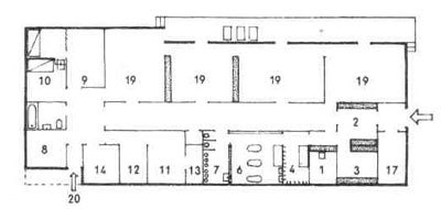 Местоположение: среди жилой застройки (как и детские сады). Вместимость: обычная - 30 - 40 детей; в одной групповой не более 20 детей. Площадь на одного ребенка 1,5 м2. Объем воздуха на одного ребенка 8 - 10 м3. Планировка помещений аналогична планировке детских садов (рис 13), но умывальные для мальчиков и девочек устроены отдельно. Душевые и раздевальная используются мальчиками и девочками поочередно. В просторной кухне (11) должны помогать 6 — 8 детей, для чего необходимо предусмотреть соответствующую высоту предметов оборудования (плита и т. п.). Необходима также мастерская (18) размером около 3 х 4 м. Полы по возможности бесшовные, что облегчает уборку. В детских яслях устраивают лучистое отопление в полу или, по меньшей мере, предусматривают надежную теплоизоляцию пола. Нижняя часть стен должна быть моющейся. Необходимо по возможности обеспечивать сквозное проветривание. Вся мебель и оборудование должны соответствовать росту детей.