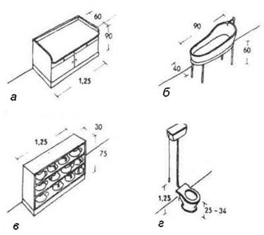 10. а) Стол для пеленания, б) Детская ванна, в) Полка для горшков, г) Детский унитаз