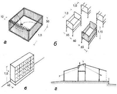 11. а) Манеж, б) Кроватки для грудных детей, в) Шкаф для игрушек, г)Поперечный разрез одноэтажного здания детского сада со сквозным проветриванием через фонарь верхнего света над коридором.