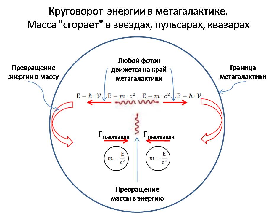 Метагалактика стабильна. Согласно круговороту энергии в метагалактике получаем картину, при которой преобразованная энергия в массу – атомы водорода (как конечный продукт) выпадает как "снежок" на краю метагалактики, либо в любом другом месте (где может произойти такое преобразование). Дальние галактики всегда более молодые, чем находящиеся ближе к центру метагалактики. Происходит процесс оседания массы к центру силами гравитации. Ближе к центру масса была бы больше, чем у периферии, но в силу "испарения" массы этого не происходит. Масса движется к центру медленно и "испаряется" медленно, но как только произошло преобразование массы в энергию, фотон движется к периферии со скоростью света. И в среднем энергия (в любом виде) в метагалактике распределена равномерно (изотропия). Помимо этого происходит процесс очищения вакуума от газа и пыли от периферии к центру метагалактики. Это связано с поглощением вещества галактиками с течением времени. Это объясняет процесс красного смещения: