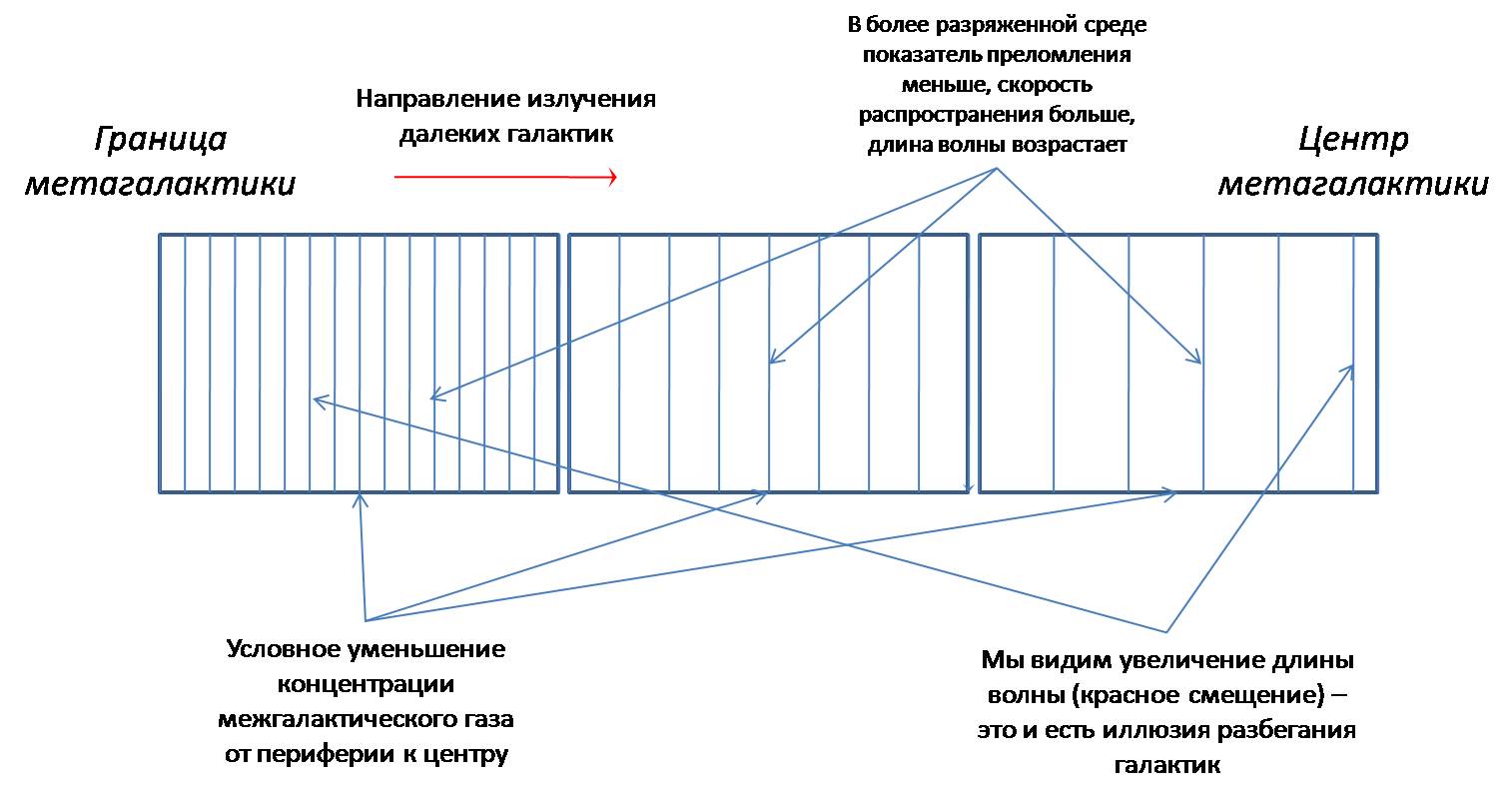 Так же, согласно этим "механизмам", можно описать ситуацию с красным смещением – не как всё большее разбегание дальних галактик, а своего рода "сжимание" близких к центру. Наблюдаемая иллюзия красного смещения оказывается одной и той же и в том, и в другом случае. Действия этих законов объясняют эффект красного смещения при стабильной метагалактике, а также, что важно, дают основание считать измеренные габариты метагалактики фактически меньше значения 1026 метров, и, следовательно, более близкой к расчетной, учитывая число Семенова – 105, а именно, к значению 1025 метра. Механизм регуляции метагалактики таков, что "лишняя" масса тяжелых элементов сжигается (превращается в энергию фотонов), и эта энергия (потенциально возможная материя) переносится ближе к краю метагалактики. Отработанное топливо звёзд – тяжёлые элементы – поступают в более мощную топку (частично в пульсары), но львиная доля поглощения тяжелых элементов приходится на квазары (центры галактик). Галактика – своего рода сепаратор: более тяжелые элементы (области с большей концентрацией тяжелых элементов) передвигаются ближе к её центру. Динамикой ("гидравлика" галактики) этого процесса объясняется то, что в галактике не соблюдаются законы тяготения. Таким же образом рассматривается динамика метагалактики.