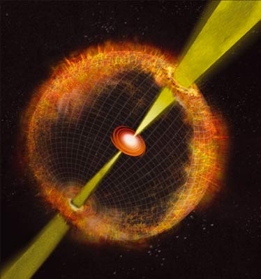 Нейтроны в свободном состоянии или в ядре, состоящем только из них, находиться не могут. Это короткоживущая частица. Поэтому нейтронных звезд с такой формулировкой существовать не может. Это объект с определённой массой обычных тяжелых металлов –сверхупакованных. Пульсар и квазар имеют одну и ту же природу – это объекты, достигшие такой массы, что в их центре давление такое (давление на дне океана существенно!), что электрон опускается на ядро атома и происходит "аннигиляция" электрона и протона. Это происходит с выделением потенциальной энергии заряженных частиц (электрон, протон), протон в этой ядерной реакции превращается через определенные стадии взаимодействия кварков в нейтрон, который в свободном состоянии быть не может. И уже из нейтрона рождаются другие частицы, которые не могут иметь никакой заряд, т. к. давление в центре квазара или пульсара не даёт вновь образоваться никаким заряженным частицам. В результате получается такая ситуация, что в центре такого объекта любая масса превращается в энергию фотонов. Никакой черной дыры (в истинном смысле) быть не может. Тем более черная дыра никак не может испускать мощнейшие потоки излучения – это не черная дыра, это другое. Чем больше массы поглощается таким объектом, тем больше поток излучения в квазаре или пульсаре. Происходит динамическая стабилизация процесса: увеличение массы квазара ведет к увеличению потока излучения. Стабилизация процесса сравнивает скорость поступления массы и скорость излучения квазара, аналогично динамическому балансу на солнце. В центре солнечной системы или в центре галактики масса тяжелых элементов не может быть больше определенного значения – их регуляторы – пульсар и квазар. Если пульсар попадет в центр галактики, он превратится в квазар. Если столкнутся два квазара или пульсара, то останется один, другой превратится в энергию излучения. Полностью излучившие квазары или пульсары превращаются в "блуждающие" квазары (пульсары) – это один и тот же объект определенной массы, уже не излучающий. Такие объекты и являются центрами начала кристаллизации – образования новых звезд и галактик. Это своего рода пылесосы энергии – поглощают материю и испускают со скоростью света фотоны. Эти объекты непосредственные участники круговорота энергии в метагалактике.