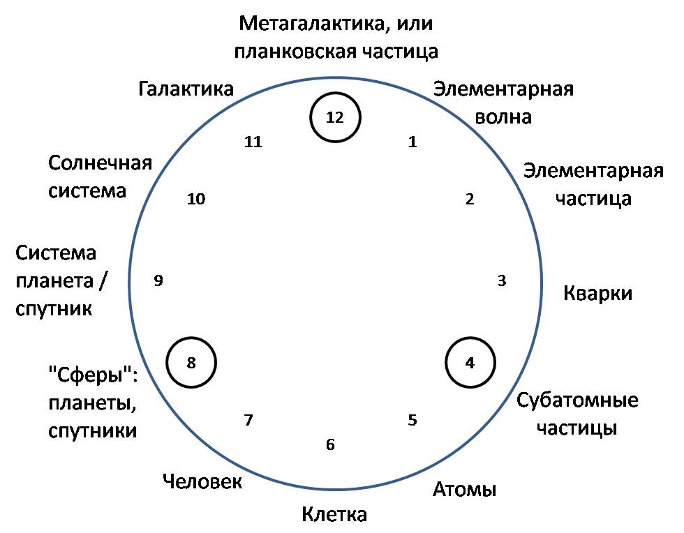 В "черных дырах" не теряется информация, там теряется дубликат. Теперь мы видим, что метагалактика стабильна и имеет определенные размеры. Метагалактики должны иметь определенные размеры, согласно основному закону периодичности – 12-й уровень (1025 метров). Метагалактика тождественна панковской частице: 1. Раскрытие тайны циферблата (число 12 и 5 секунд). 2. Функция распределения простых чисел, косвенно доказывает, что единица эквивалентна (тождественна) понятию "бесконечность". А именно: При n = 1 знаменатель становится равен нулю. В приближении сама дробь стремится к бесконечности. Единица имеет те же свойства что и бесконечности. 3. В основном законе периодичности замечаются следующие закономерности: ∙метагалактика явно имеет сферическую форму; ∙протоны и нейтроны имеют сферическую форму; ∙планеты и спутники имеют сферическую форму. Мы наблюдаем периодичность через четыре уровня. В дальнейшем мы увидим периодичность и у других уровней. Наглядно это можно изобразить так: