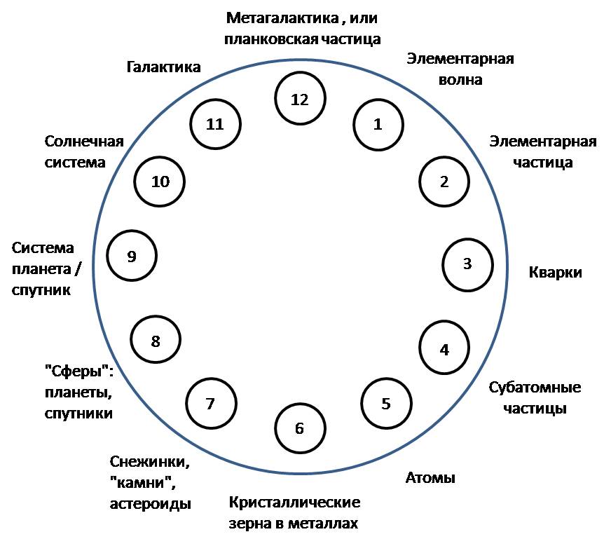 Или: (1025/10-35)3=(1060)3=10180 – планковских частиц существует в метагалактике. Это гармонично вписывается в ландшафт теории струн, предполагающей существование от 10100 до 10500 вариантов так называемых ложных вакуумов. 7. Все, гармонично связанные воедино, описанные доказательства цикличности и периодичности мироздания. 8. Планковские частицы (корпускулы) являются "полузакрытыми" черными дырами. Метагалактика обладает как квантовыми, так и макросвойствами – это особый вид взаимодействия структурных сил. 9. Выводы фрактальной теории (теории бесконечной вложенности материи). Всё – это взаимное движение метагалактик, которых нет. Мир стабилизировался эволюционно. 10. Интуитивная естественность. Сознание не сопротивляется. 11. Бесконечный звукоряд. Он не "останавливается". В мире нет симметрии, поэтому преобладание материи над антиматерией носит естественный характер, связанный со строением "заряда" и "войной" между этими состояниями существования частиц и античастиц за право преобладания в мире. Все структурные элементы любого из уровней носят индивидуальный характер: в природе нет одинаковых галактик, солнц, планет, людей, клеток, атомов, субатомных частиц и т. д. Это объясняется наличием похожести только в общей структуре. Например, все галактики имеют центр и материю вокруг себя – на этом их сходство для отнесения их к 11-му уровню заканчивается. Но для метагалактики эти различия не имеют никакого значения, для неё все галактики одинаковые (функционально они выполняют определенную работу для жизнедеятельности системы следующего уровня, этого вполне достаточно). Аналогично описывается положение на любом другом уровне. На атомном уровне: все атомы водорода одинаковые, да, они имеют центр и "материю" вокруг этого центра. И на этом их сходство заканчивается. Дальше начинается великое разнообразие квантовых состояний. Так же и любая биосистема, имея общие черты, имеет и огромное разнообразие своего состояния. Каждая планковская частица индивидуальна. Все метагалактики не похожи друг на друга. Всё мироздание имеет выраженный индивидуальный характер. В периодическую систему уровней неживой природы можно внести уточнения, а именно, уровень шесть соответствует кристаллическим зернам, например в металлах, их средние размеры также имеют порядок 10-5 метра. Седьмой уровень представлен следующими структурами: снежинка, скопление кристаллических зёрен 6-го уровня: "камней", астероидов и т. п. Периодичность неживой материи имеет вид: