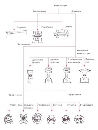 1 КОМПРЕССОРНЫЕ УСТАНОВКИ 1.1 Классификация компрессорных установок По принципу действия компрессоры подразделяются на объемные и динамические (лопастные), рис1. Для объемных компрессоров характерно создание замкнутого объема газа и последующее уменьшение этого объема, при котором происходит сжатие. Поршневые компрессоры были изобретены первыми и являются самыми распространенными. Поршневые компрессоры очень разнообразны: одинарного или двойного действия, со смазкой или бессмазочные, с различным числом цилиндров и с различным расположением цилиндров (L–образное, V-образное, вертикальное W-образное и т.д. В маслосмазываемых компрессорах применяют систему естественной подачи масла и систему подачи масла под давлением. В большинстве компрессоров используются самодействующие клапаны, которые открываются и закрываются в результате разности давлений по обе стороны пластин клапана. Безмасляные поршневые компрессоры оснащаются поршнями, кольца которых изготовляются из графита или политетрафторэтилена. Более крупные машины оснащаются крейцкопфом и уплотнением на штоке поршня, а также промежуточным отсеком (вентилируемым «фонарем»), предотвращающим перетекание масла из картера в камеру сжатия газа. В мембранных компрессорах мембрана приводится в движение механическим или гидравлическим способом. Такие компрессоры используются при малых производительностях или в качестве вакуумных насосов. Винтовые компрессоры. Основными частями винтового компрессора являются ведущий и ведомый роторы, которые вращаются навстречу друг другу. При этом расстояние между ними и корпусом уменьшается – происходит сжатие газа. Возникающее осевое давление воспринимается подшипниками. Преимуществом такого компрессора является отсутствие клапанного аппарата, малые габаритные размеры. В винтовых компрессорах с сухим сжатием используется внешняя зубчатая передача, а поскольку роторы не соприкасаются друг с другом и корпусом, то требуют высокой точности изготовления. Степень повышения давления ограничивается разностью температур на входе и выпуске. Для снижения температуры в процессе сжатия в винтовых компрессорах используется впрыск охлаждающей жидкости в камеру сжатия. Чаще всего используют масло из-за хороших смазочных свойств, но может использоваться и вода. По энергетическим параметрам такие компрессоры достигли уровня лучших поршневых и центробежных машин, т.к. изотермический КПД достигает 0,66-0,68. Винтовые компрессоры по производительности выпускаются от 6 до 400 м3/мин при давлении нагнетания до 2,0 МПа. Распространенный тип объемных машин включает роторно-пластинчатые компрессоры, которые выпускаются производительностью от 1 до 100 м3/мин и на давления от 0,01 (вакуум-насосы) до 2,5 МПа. В данном диапазоне роторно-пластинчатые компрессоры имеют больший КПД, чем поршневые. Жидкостно-кольцевые более распространены в качестве вакуум-компрессоров. Производительность их доходит до 2000 м3/мин при абсолютном давлении от 0,002 МПа. Наиболее экономичны динамические компрессоры: центробежные и осевые. Центробежные компрессоры при больших производительностях от 20 м3/мин имеют высокую степень повышения давления более 100 МПа. Высокими производительностями обладают осевые компрессоры, достигающими 1000 м3/мин с относительно низкой степенью 