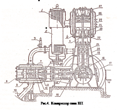 В компрессорах двухстороннего действия рабочие камеры расположены в одном цилиндре, но с разных сторон поршня. В таком компрессоре обязательна установка крейцкопфа, с которым соединяется кривошипно-шатунный механизм, а клапаны устанавливаются с двух сторон цилиндра. Для примера на рис.4 представлен разрез компрессора типа ВП. В зависимости от характера работы и назначения все детали компрессора можно разделить на несколько групп: а) группа механизма движения - рама 20 с коренными подшипниками, коленчатый вал 18 с маховиком 17, шатуны 19 и 16, крейцкопфы 15 и 21; б) цилиндровая группа – цилиндры 7 и 23 с крышками 8, 12, 24 и 27, сальники 6 и 22; патрубки - всасывающий 25 и нагнетательный 10; в) поршневая группа – поршни 9 и 26 с поршневыми кольцами, штоки 5 и 11; г) система охлаждения – промежуточный охладитель газа 2 с пучком труб 1, по которым циркулирует вода с подводом воды 14, охлаждающие рубашки цилиндров 4 и 13; д) группа распределения – самодействующие клапаны; е) система регулирования – предохранительный клапан 3, устройства для поднятия всасывающих клапанов, цилиндры дополнительных вредных пространств с клапанами включения; ж) система смазки – масляные насосы, масляные фильтры, маслопроводы, охладители и отстойники для масла.