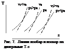 Отсюда видно, что кривые изобар располагаются на диаграмме эквидистантно. То же самое получено и для кривых изохор. Также из выражения (27) видно, что с увеличением давления энтропия уменьшается, поэтому линии изобар более высоких давлений располагаются левее изобар с низким давлением, а из уравнения (26) видно, что изохоры с увеличением удельного объема располагаются правее малых объемов, поскольку с увеличением объема энтропия возрастает.