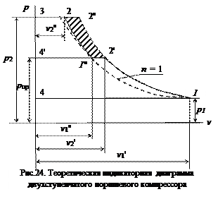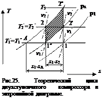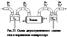 Приведенные положения убеждают, что в компрессорах одноступенчатое сжатие не только опасно, но и не целесообразно. Для нормального процесса сжатия газа обычно используется двух и более ступенчатое сжатие (рис. 23).