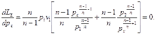6.1. Соотношение объемов цилиндров при двухступенчатом сжатии Поскольку процессы во всех ступенях компрессора одинаковы и подчиняются ранее выведенным соотношениям, то остается выяснить лишь специфические особенности двухступенчатых компрессоров. Один из главных вопросов касается соотношения распределения степеней сжатия по ступеням и объемов цилиндров. Для выяснения этих положений основным критерием является экономия в затрачиваемой работе. Величина такой экономии зависит от выбранного промежуточного давления (давления газа в промежуточном холодильнике) р х, которым определяется и соотношение объемов рабочих цилиндров. Таким образом, необходимо найти минимум затраченной работы при двухступенчатом сжатии L Σ. Для этого нужно взять первую производную работы по давлению в промежуточном холодильнике и приравнять ее нулю. Считая, что показатели политропы одинаковы в обоих циклах, т.е. n1 = п2 = п, и температура газа при входе в первую и вторую ступени одинаковы, т.е. Т1 = Т2, суммарная работа одного цикла двухступенчатого компрессора, как L Σ = L 1 ст + L 2 ст, будет иметь вид