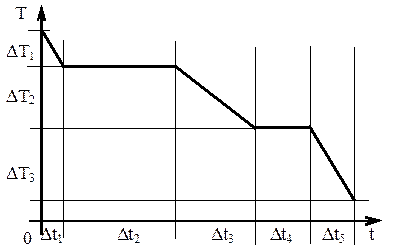 На рисунке представлен график зависимости абсолютной температуры T воды массой m от времени t при осуществлении теплоотвода с постоянной мощностью P. В момент времени t = 0 вода находилась в газообразном состоянии. Какое из приведенных ниже выражений определяет удельную теплоемкость жидкой воды по результатам этого опыта?