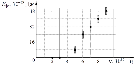 При изучении явления фотоэффекта исследовалась зависимость максимальной энергии Е фэ вылетающих из освещенной пластины фотоэлектронов от частоты n падающего света. Погрешности измерения частоты света и энергии фотоэлектронов составляли соответственно 5×1013 Гц и 4×10–19 Дж. Результаты измерений с учетом их погрешности представлены на рисунке. Согласно этим измерениям, постоянная Планка приблизительно равна