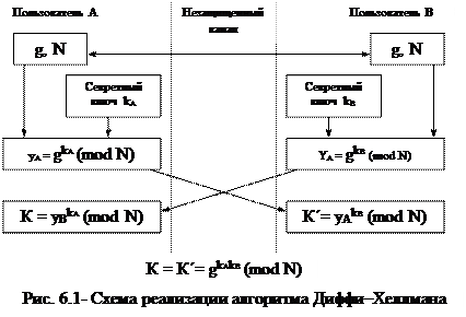 Алгоритм Диффи–Хеллмана был первым алгоритмом с открытыми ключами (предложен в 1976 г.). Его безопасность обусловлена трудностью вычисления дискретных логарифмов в конечном поле, в отличие от легкости дискретного возведения в степень в том же конечном поле. Предположим, что два пользователя А и В хотят организовать защищенный коммуникационный канал. 1. Обе стороны заранее уславливаются о модуле N (N должен быть простым числом) и примитивном элементе g, (1 £ g £ N –1). Эти два целых числа N и g могут не храниться в секрете. Как правило, эти значения являются общими для всех пользователей системы. 2. Затем пользователи А и В независимо друг от друга выбирают собственные секретные ключи kА и kВ (kА и kВ – случайные большие целые числа, которые хранятся пользователями А и В в секрете). 3. Далее пользователь А вычисляет открытый ключ yA = а пользователь В – открытый ключ yВ = 4. Затем стороны А и В обмениваются вычисленными значениями открытых ключей yA и yВ по незащищенному каналу. 5. Далее пользователи А и В вычисляют общий секретный ключ, используя следующие выражения: пользователь А: К = пользователь В: К´ = При этом К = К´, так как Схема реализации алгоритма Диффи–Хеллмана показана на рис. 6.1. Ключ К может использоваться в качестве общего секретного ключа (ключа шифрования ключей) в симметричной криптосистеме. Кроме того, обе стороны А и В могут шифровать сообщения, используя следующее преобразование шифрования (типа RSA): С = ЕK (М) = МК (mod N).