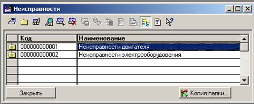 Цвета автомашин. Замены к работам. Справочник Замены к работам, подчиненный справочнику Работы, содержит список работ, которые могут быть использованы при оформлении документов вместо данной работы. У каждого элемента справочника Замены к работам есть реквизит Вид замены (может принимать значения Взаимозаменяемая и Невзаимозаменяемая). Если Вид замены установить в Взаимозаменяемая, то замены будут “симметричными”. В противном случае замены будут “односторонними”. Замены в документах можно использовать при подборе по каталогу в режиме запроса (кнопка Замены). Справочник содержит перечень цветов автомашин. Цвет указываются к карточке автомобиля. Введите несколько цветов: Справочники → Дополнительные для ремонта → Цвета автомашин. Справочник используется при заполнении документа Заявка на ремонт. Содержит перечень неисправностей. Помимо наименования, для каждой неисправности можно задать код. Для данного справочника целесообразно использовать многоступенчатую структуру. Введите неисправности двигателя: Справочники → Дополнительные для ремонта → Неисправности.